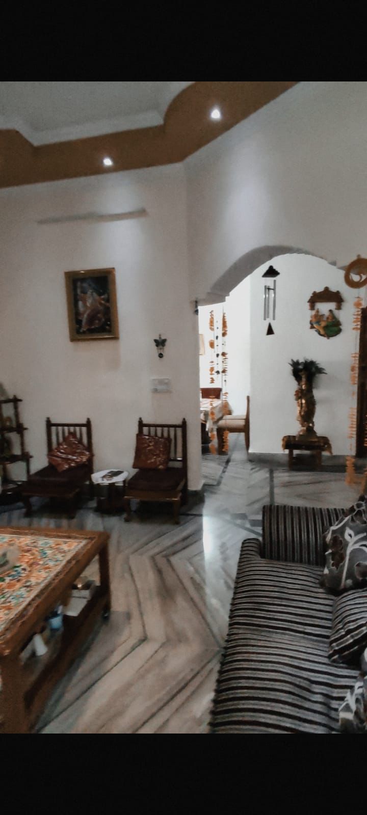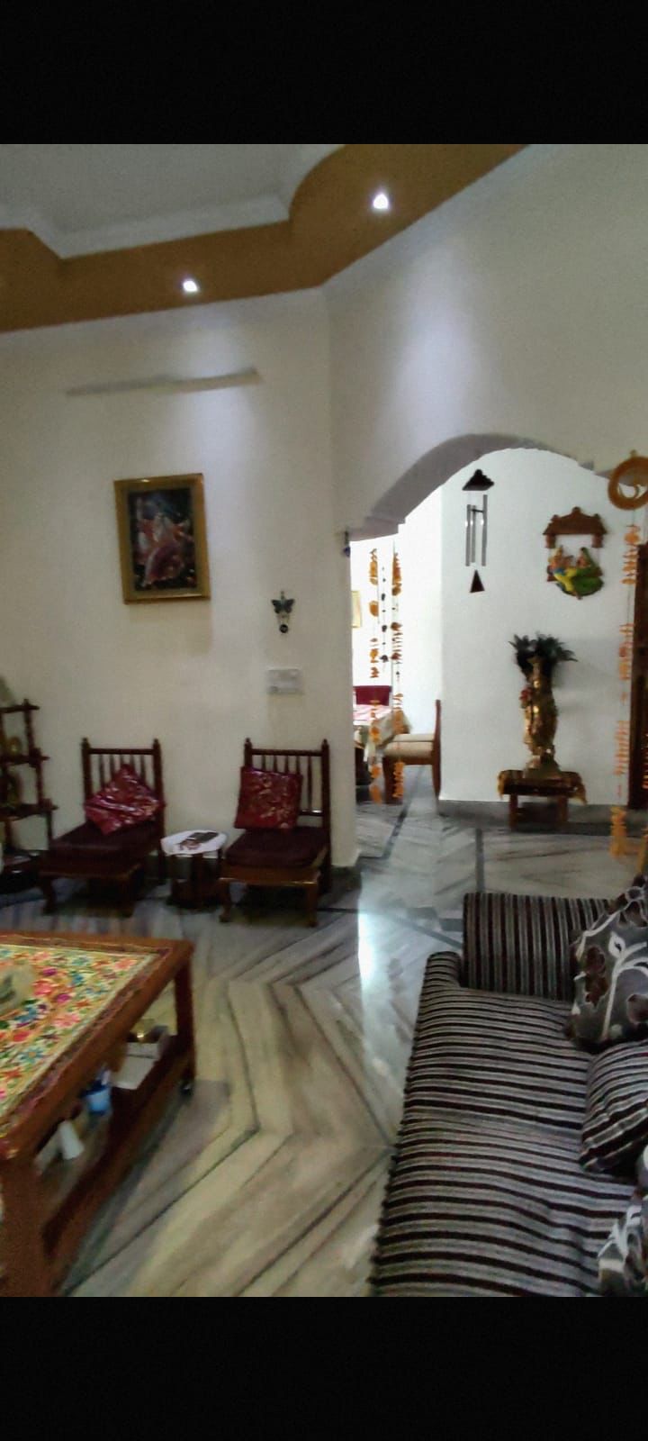 Bungalow has 7 Bedrooms with attached Bathrooms. 2 Drawing Rooms one on each Floor. 2 Kitchens, 1 on each Floor. 1 Puja Room. Lobbies and Balconies. Ceilings have design and colour.